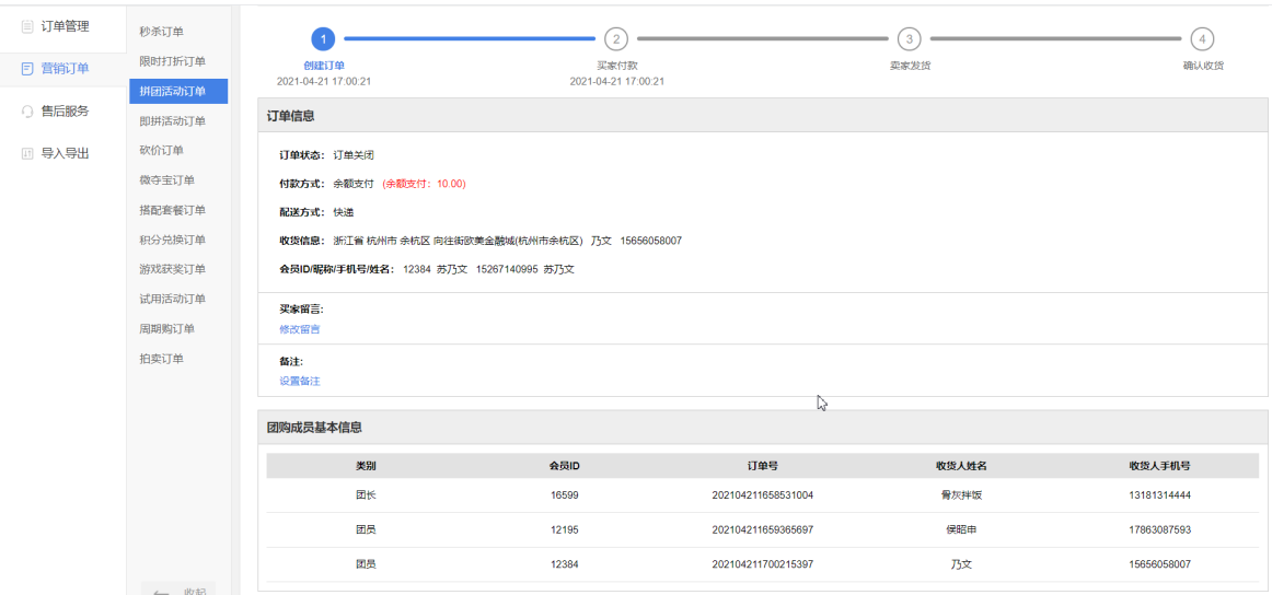 1)后臺查看抽獎團訂單詳情顯示“團購成員基本信息”