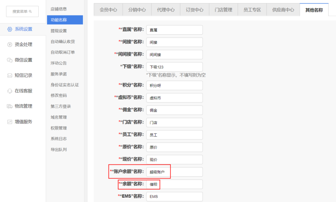 現邏輯:其他設置增加”余額”名稱自定義,手機端”余額”顯示跟隨系統設置變動