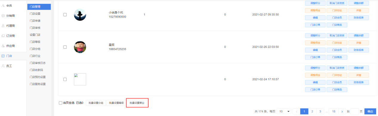 現邏輯:門店-門店管理,增加批量設置營業按鈕,可以批量設置門店是否營業