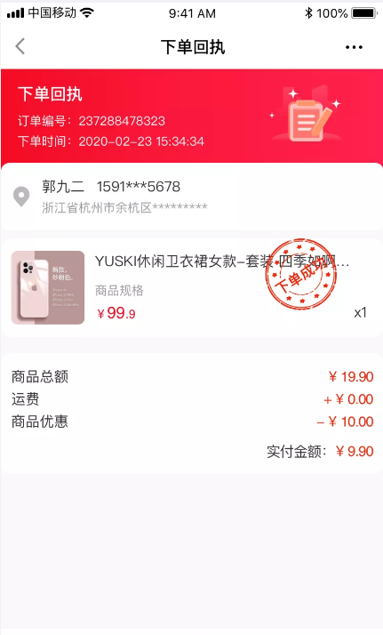 現邏輯:款成功后,手機端訂單詳情增加下單回執,點擊下單回執可以生成一張圖片,顯示下單成功,圖片中顯示訂單編號、下單時間、收貨人、地址、商品及規格、數量、總額、運費、實際支付金額。