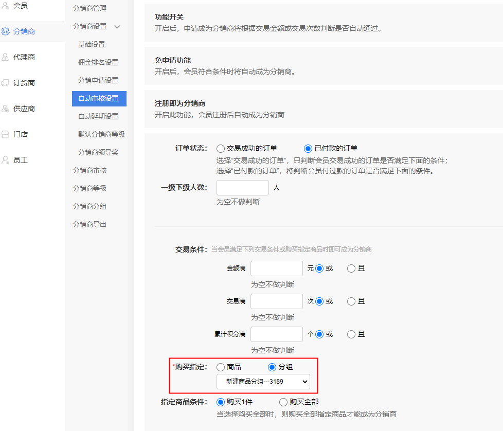 現邏輯:會員--分銷商--自動審核設置,自動審核商品增加“商品分組”設置