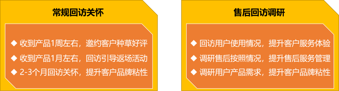 在用戶購買產品后,做邀約用戶種草好評、引導返場活動、回訪使用情況、調研產品需求等環節,提升用戶服務體驗和品牌粘性。