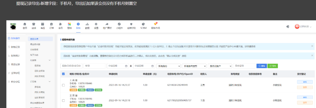 后臺操作描述:提現記錄導出-新增字段:手機號