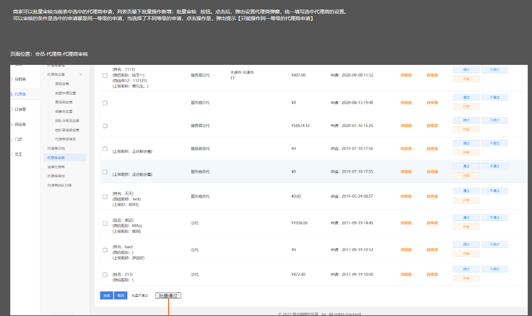 功能描述:商家可以批量審核當前表中選中的代理商申請,列表頁最下批量操作新增【批量審核】按鈕,點擊后,彈出設置代理商彈窗,統一填寫選中代理商的設置。可以審核的條件是選中的申請都是同一等級的申請,當選擇了不同等級的申請,點擊操作是,彈窗提示【只能操作同一等級的代理商申請】。