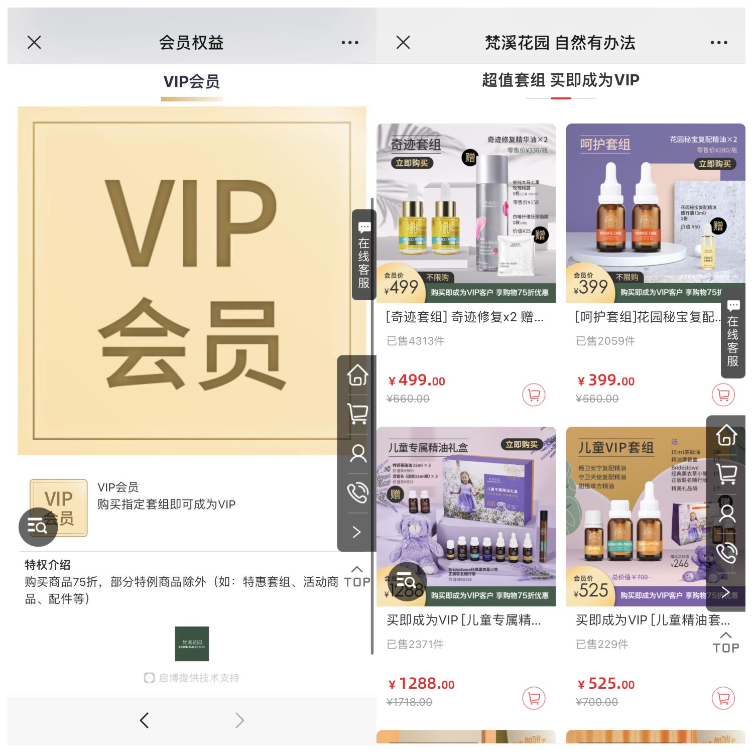 梵溪花園微商城除了通過上線各種促銷活動(dòng)提升商城流量轉(zhuǎn)化外,在微商城內(nèi)還上架了新人專享優(yōu)惠商品,用戶購買指定禮包即可升級(jí)為商城VIP,享受75折優(yōu)惠,除部分特例商品外(特惠套組、活動(dòng)商品、配件等),多方式拓客拉新,營造購物氛圍帶來更多銷量。