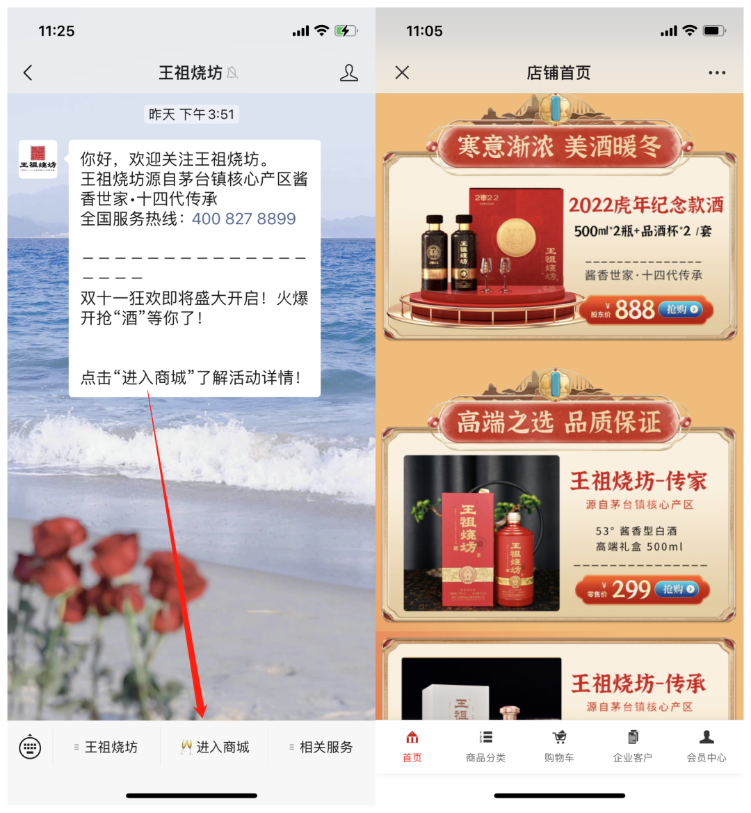 關注「王祖燒坊」公眾號后,在自動歡迎語中引導用戶點擊菜單欄“進入商城”直接下單。