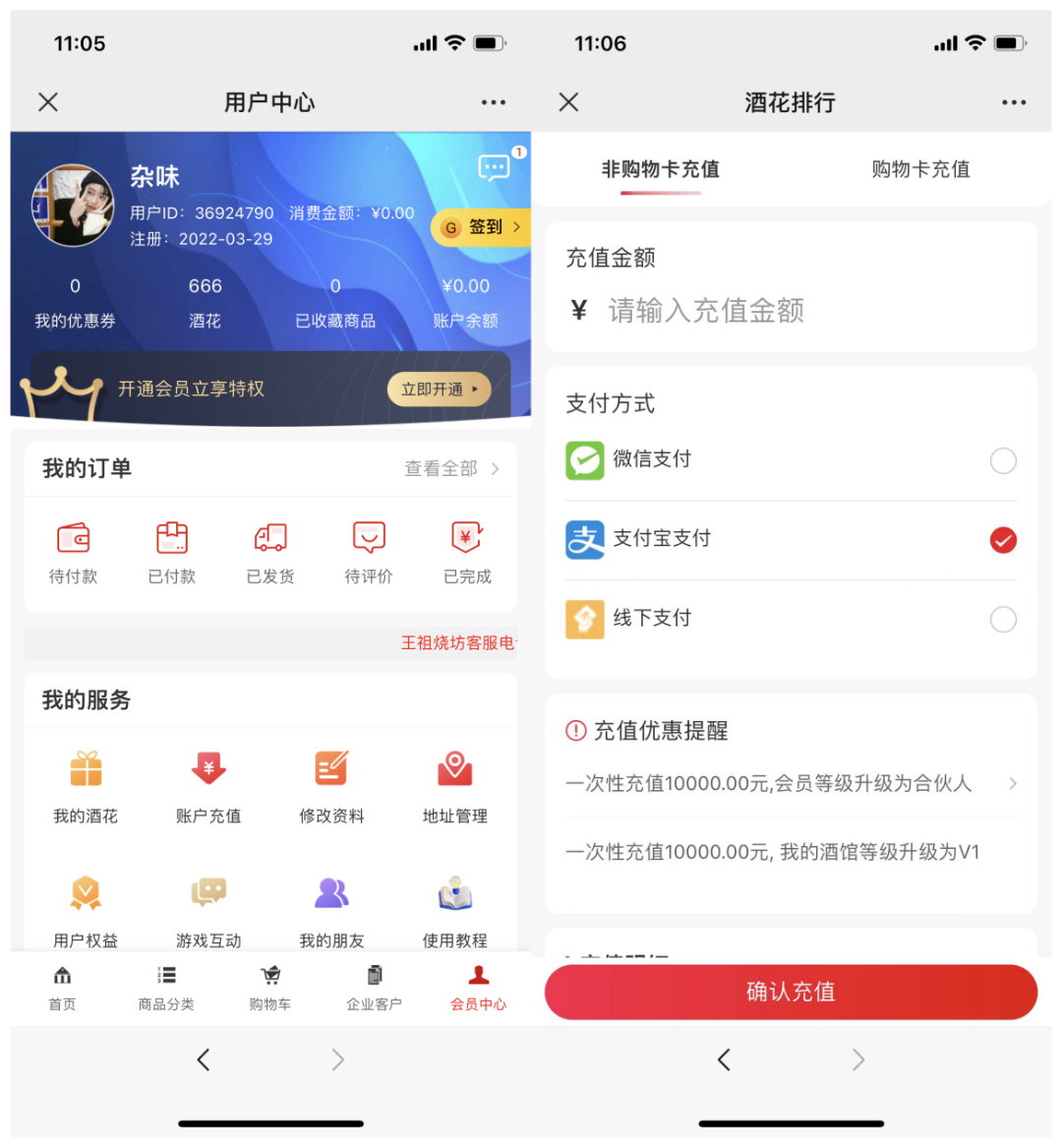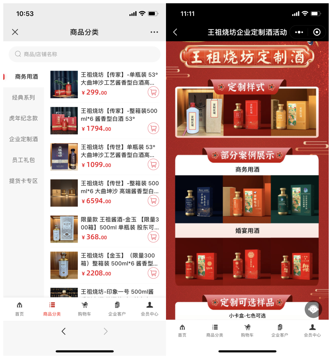 王祖燒坊合作啟博微分銷,同時部署了小程序商城和h5微商城,商品、會員、訂單等數據互通,商城分布統一都是“首頁”、“商品分類”、“購物車”、“企業客戶”、“會員中心”五大模塊構成。