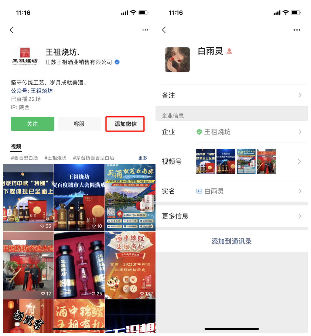 結合線上小程序商城,「王祖燒坊」也進一步將公眾號、視頻號實現了觸達、溝通、轉化的一體化全鏈路經營閉環。也將品牌資源優勢充分放大,助力用戶深度沉淀,為用戶提供更加近距離的交互。在視頻號「王祖燒坊」的主頁內設置福利官「白雨靈」的企微,引導進入小程序商城。