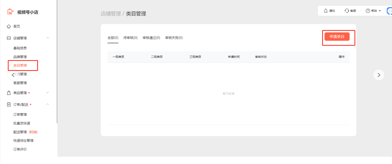 當售賣的商品需要類目資質時,商家需前往視頻號小店后臺,【店鋪管理-類目管理】頁面,點擊【申請類目】,根據頁面要求提交對應的類目資質。申請成功才可正常將商品同步至視頻號小店。