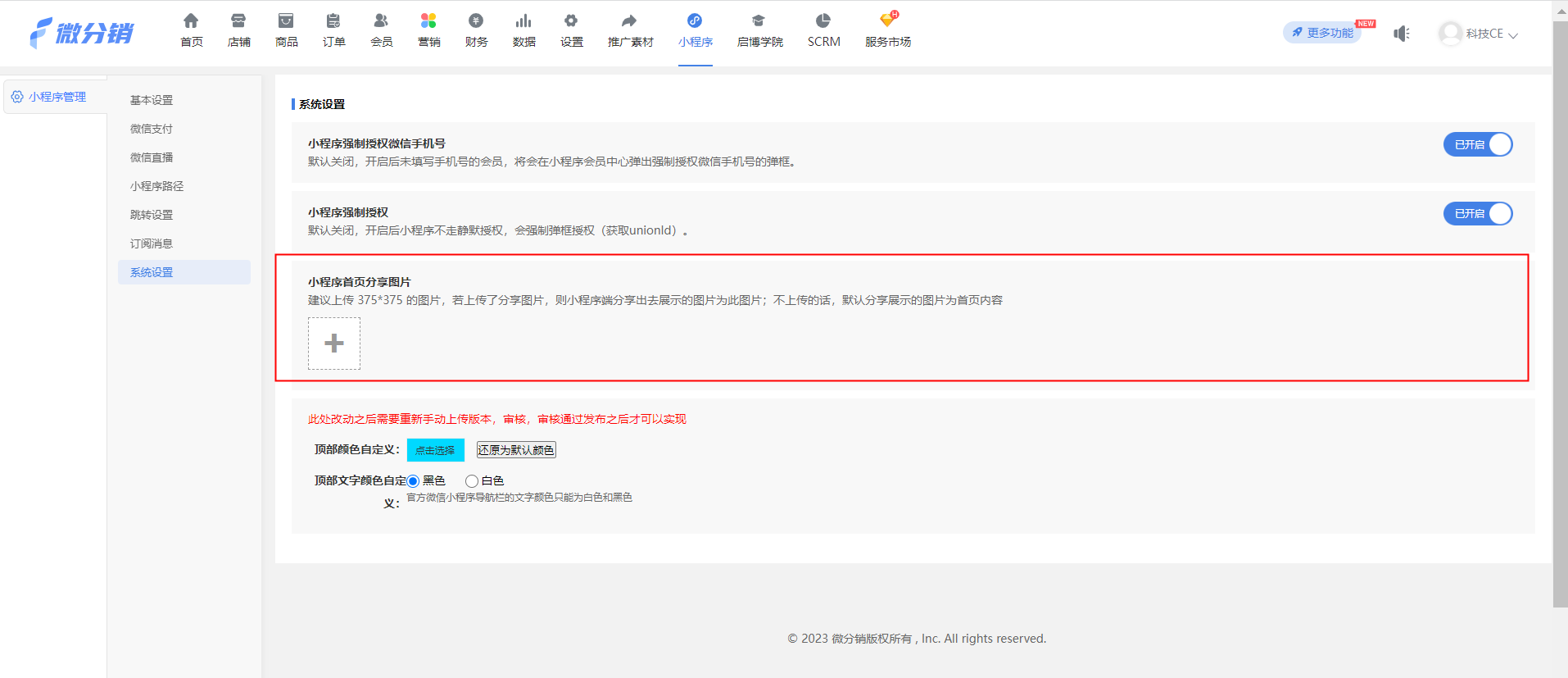 主頁裝修-新增配置【首頁分享圖片】,用于控制微信端-聊天頁面分享小程序組件