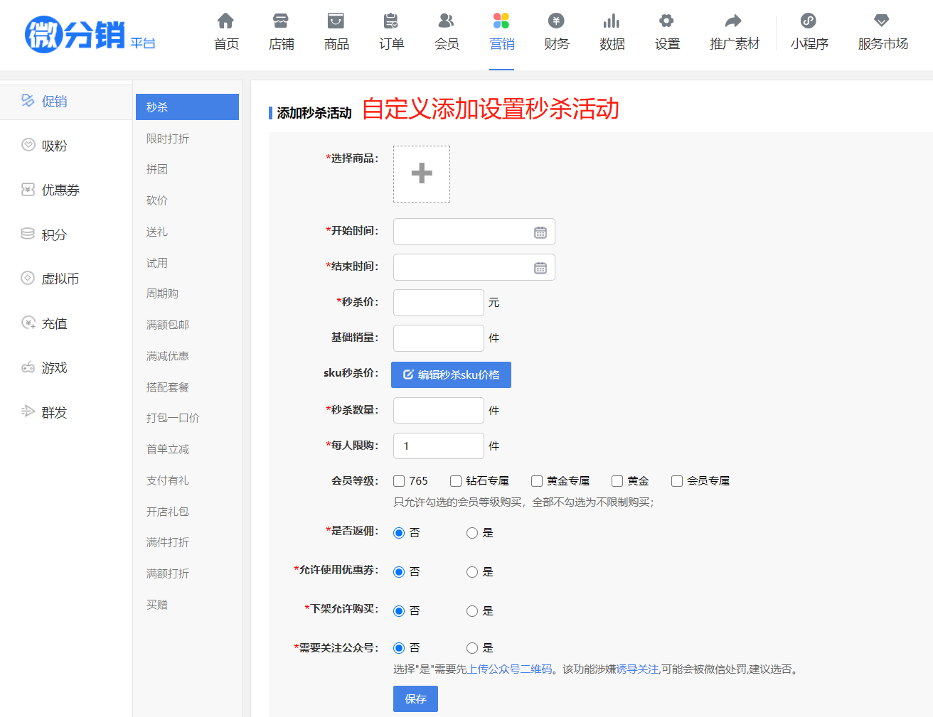 1、如何在啟博微分銷商家管理后臺創(chuàng)建一場“限時秒殺”活動: