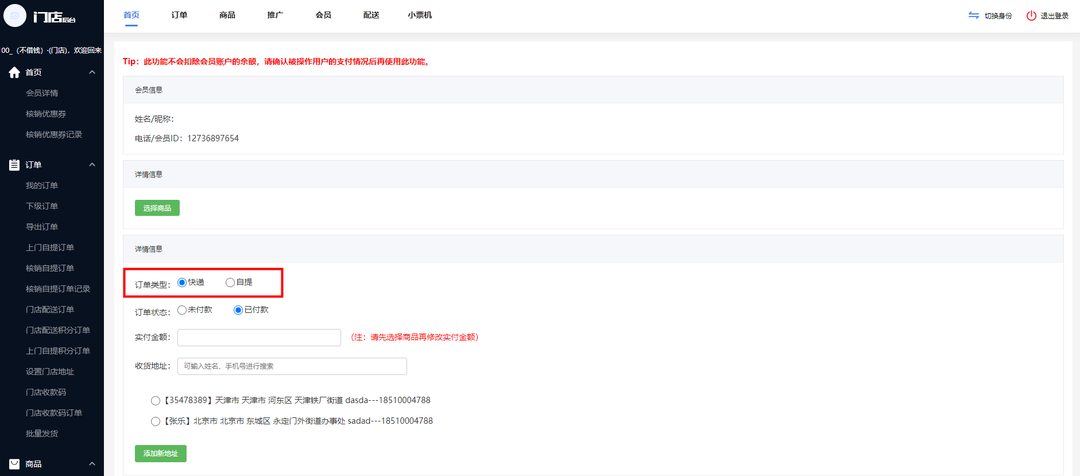 現(xiàn)邏輯:新增訂單類(lèi)型,門(mén)店后臺(tái)創(chuàng)建訂單可以選擇快遞/自提