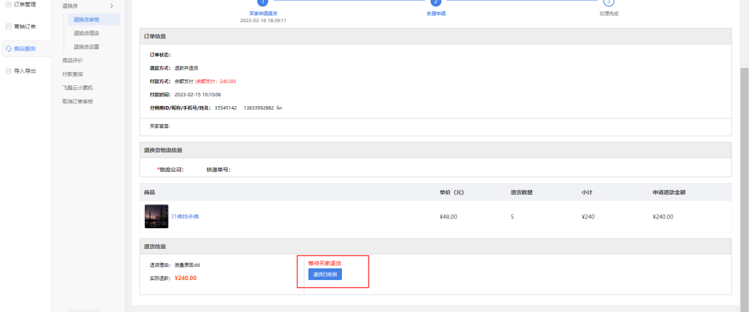 針對(duì)開(kāi)啟新版退換貨流程之后,買(mǎi)家長(zhǎng)期不填寫(xiě)退貨快遞單號(hào)商城后臺(tái)新增操作按鈕,點(diǎn)擊“退貨已收到” 默認(rèn)直接退款