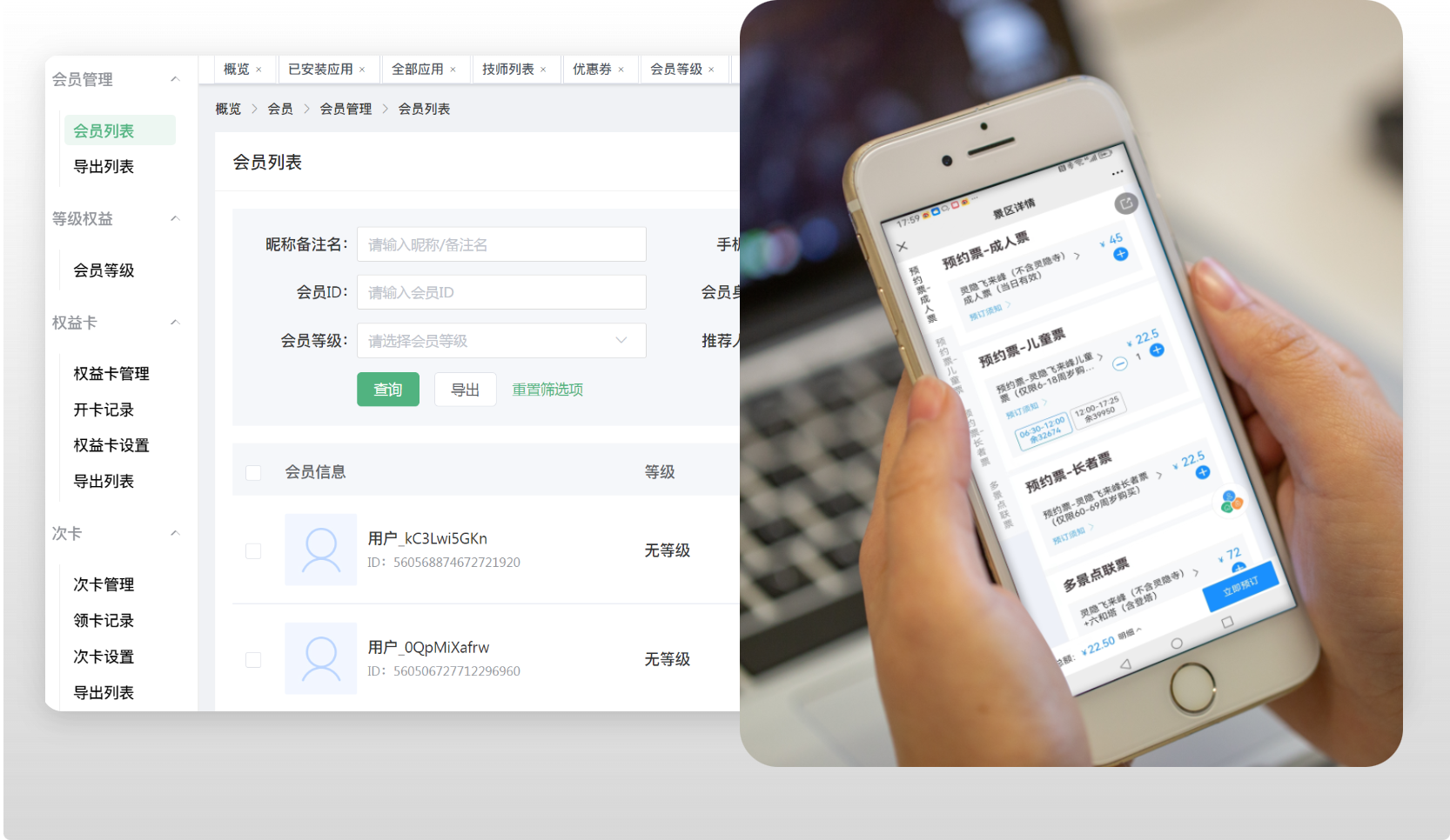 會員信息管理,會員權益、消費明細等均可查詢,會員用戶畫像標記,實現商家對會員的高效管理,會員儲值、會員積分/標簽、積分商城等功能促進私域會員沉淀,多種場景的消息通知,觸達商家及會員,提升顧客體驗。